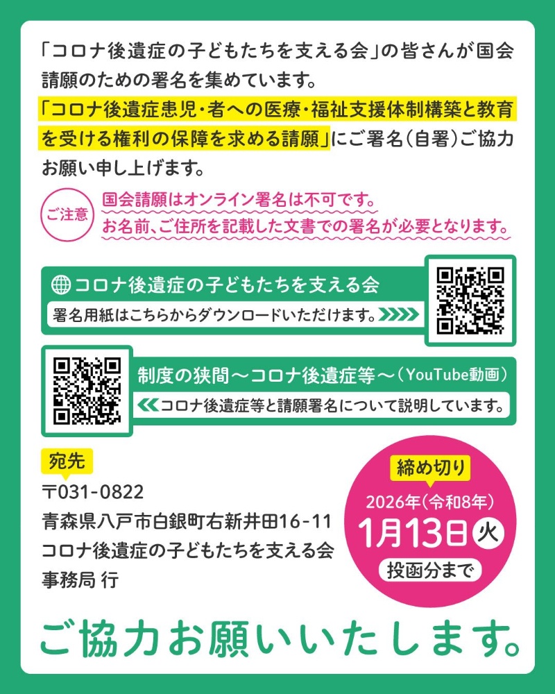 「コロナ後遺症等患児・者への医療・福祉支援体制構築と教育を受ける権利の保障を求める請願」にご署名(自署)ご協力お願い申し上げます。